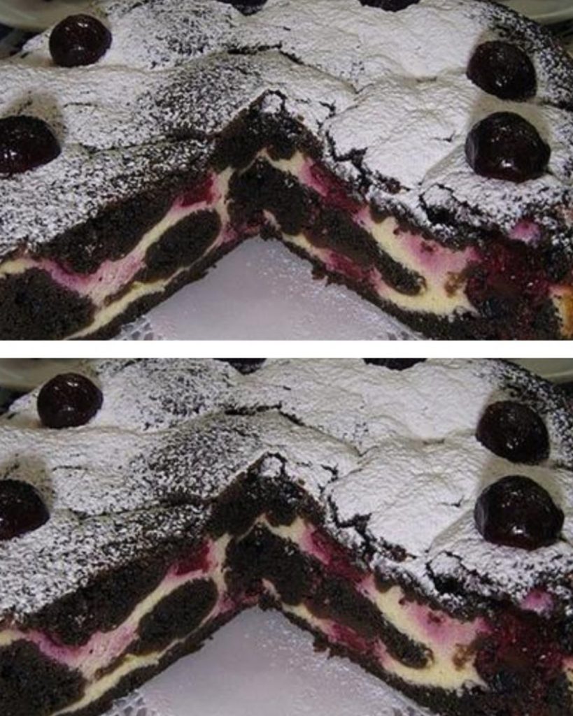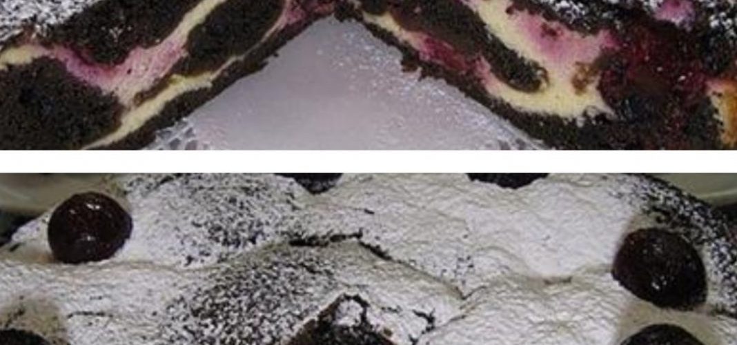 9. Потім викласти шоколадне тісто, вершковий сир, вишню і останнім шаром – тісто, що залишилося.