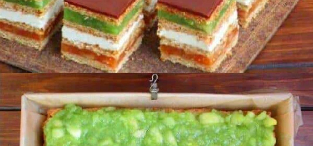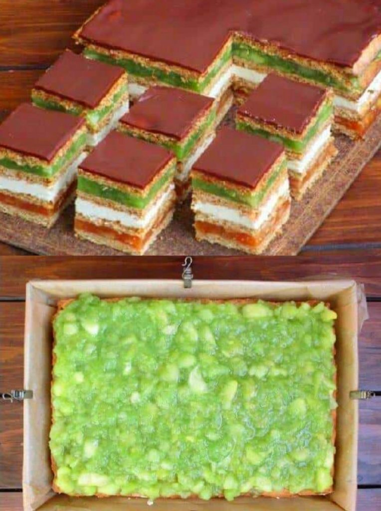 Точно так само зробите з другою половиною яблук, тільки тепер уже додайте желе з агрусу. Виклавши зелену яблучну масу на третій корж, розрівняйте її, накрийте останнім коржем і відправте в холодильник.