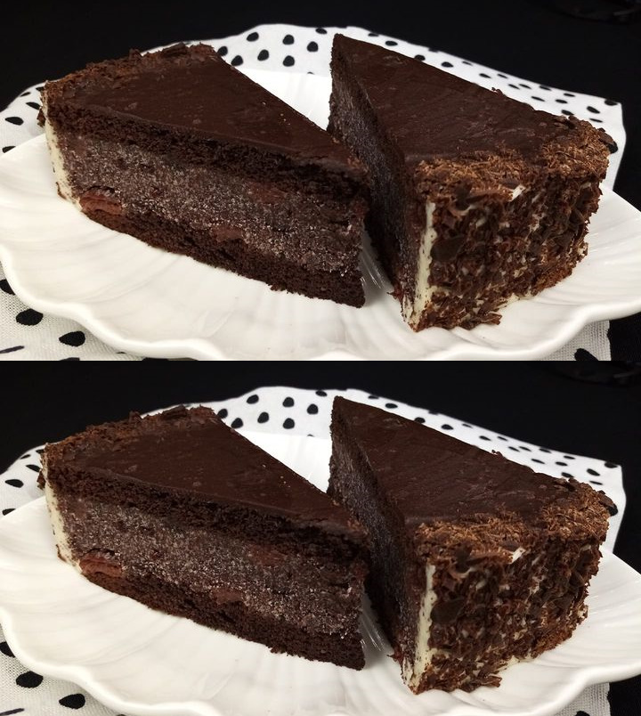 - Нижній та верхній корж змочити соком з вишень, розбавленим з кип’яченою водою у співвідношенні 1:1. У форму, в якій торт випікався, покласти нижній корж, викласти начинку з вишнями, прикрити верхнім коржем і злегка притиснути. Торт помістити в холодильник на 1 год.