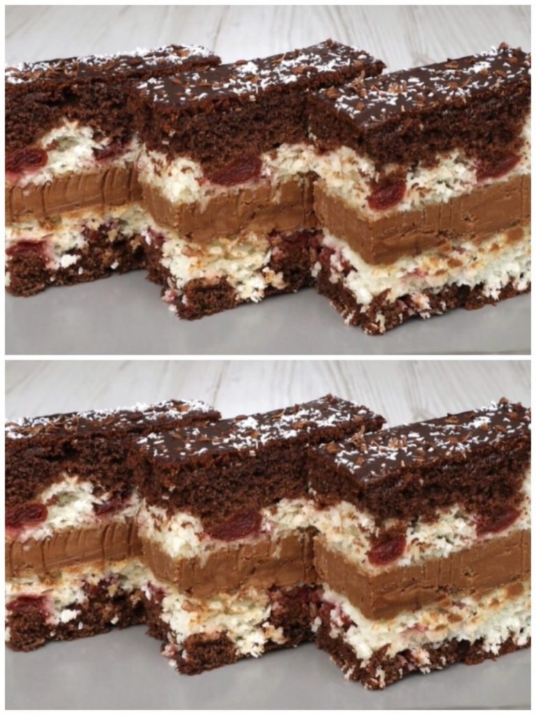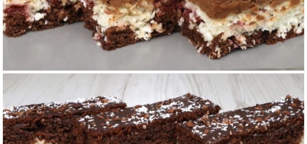 У форму розміром 25×35 см викласти кокосову масу, далі вишні та залити шоколадним тістом. Випікати 45-50 хв при 170 °С.