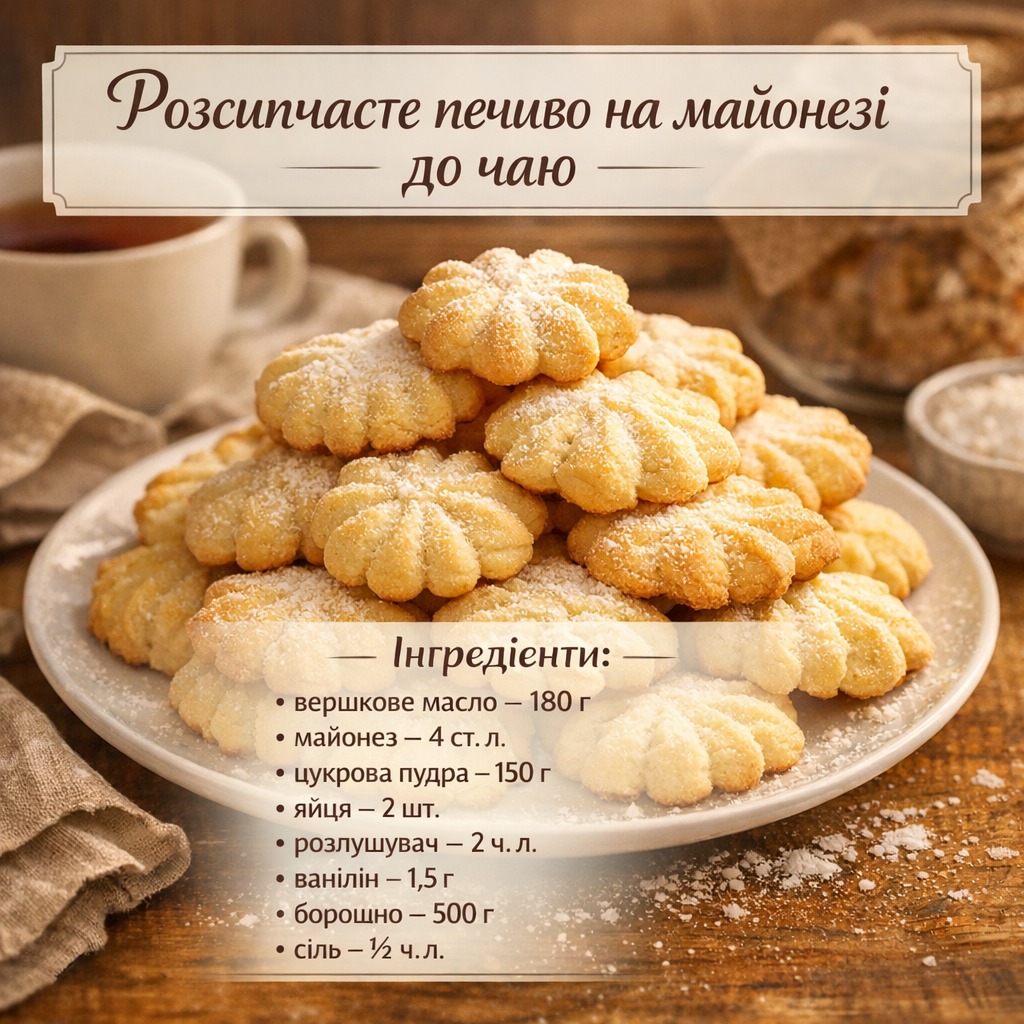 Печиво на майонезі відрізняється своєю розсипчастістю та ніжністю, і ці якості роблять його ідеальним супроводом до чаю чи кави.