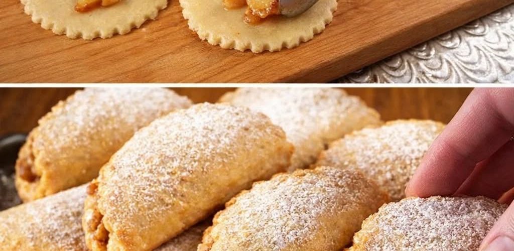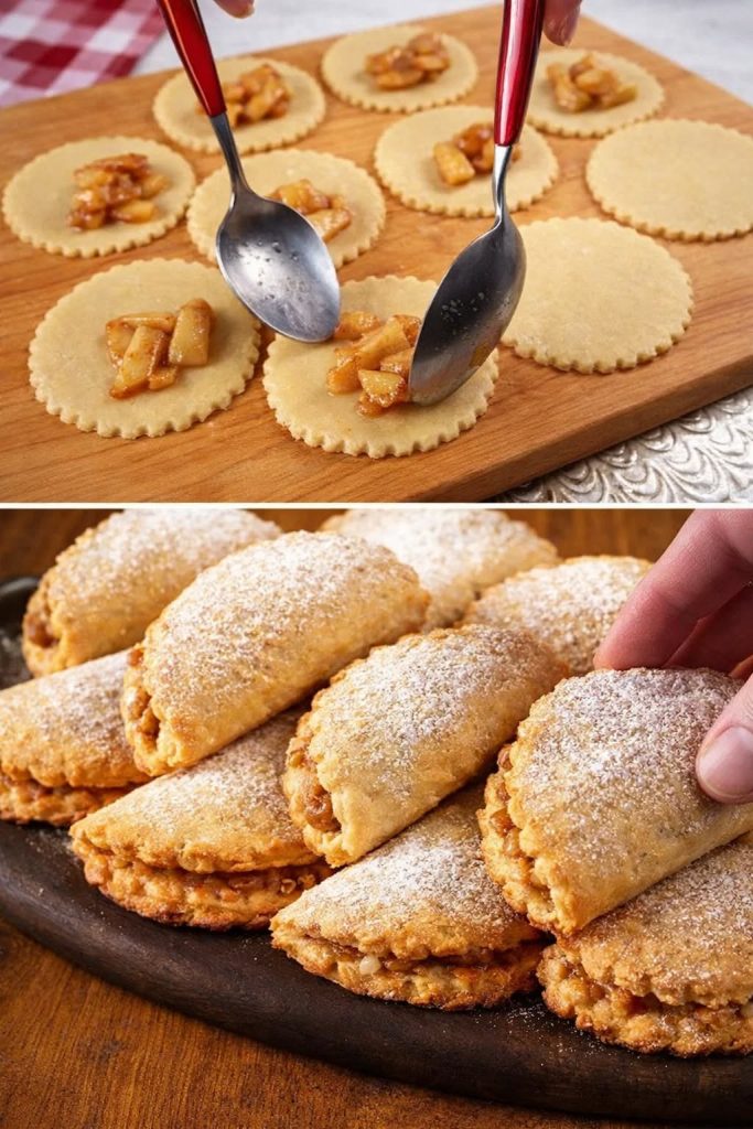 Розігрійте духовку до 180°C. Деко застеліть пергаментом. Розкачайте тісто до товщини 3–4 мм, наріжте квадратами або виріжте кружальця. У центр викладіть 1–2 ч. л. начинки, сформуйте тістечка та викладіть на деко. Змастіть жовтково-молочною сумішшю.