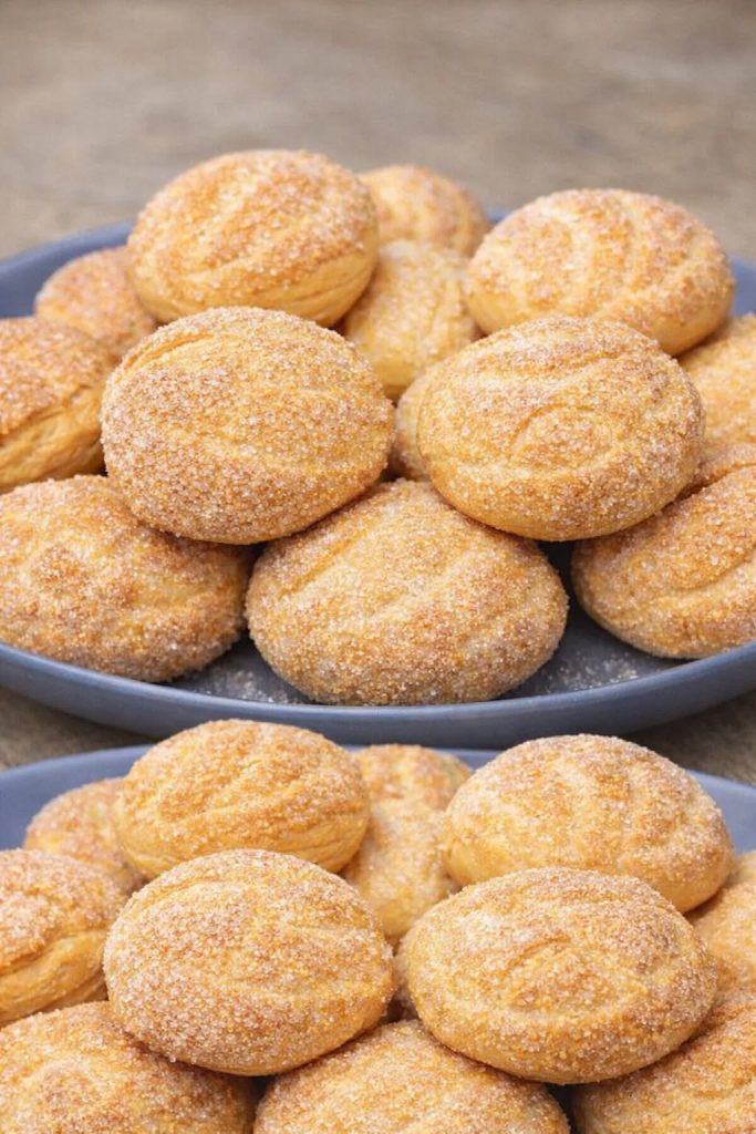 У невелику тарілку насипте цукор. Кожну кульку занурте верхівкою в цукор і викладіть на деко, застелене пергаментом, залишаючи відстань між печивом.